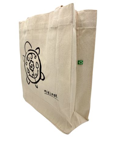 Our tote bag design features a simplistic version of our Mikinok brand logo. The bag was designed by a fantastic local artist, Luke Huff - a descendent of the Turtle Mountain Band of Chippewa.